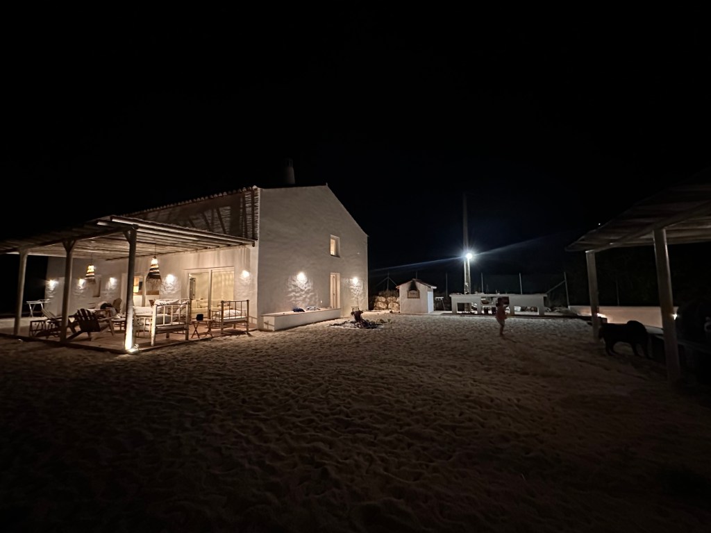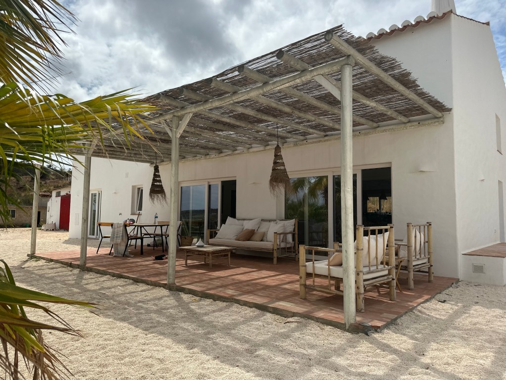 No exterior são várias as zonas de estar, cozinha com churrasqueira, forno a lenha, mesa de refeições protegida por telheiro de palhinha e lareira de exterior (fire pit). Tem também uma piscina com bancos no interior para que se possa sentar e aproveitar para descansar, espreguiçadeiras no areal, zona de parque infantil com baloiços, escorregas, e trampolim, e campo de ténis de praia.