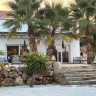 No exterior são várias as zonas de estar, cozinha com churrasqueira, forno a lenha, mesa de refeições protegida por telheiro de palhinha e lareira de exterior (fire pit). Tem também uma piscina com bancos no interior para que se possa sentar e aproveitar para descansar, espreguiçadeiras no areal, zona de parque infantil com baloiços, escorregas, e trampolim, e campo de ténis de praia.